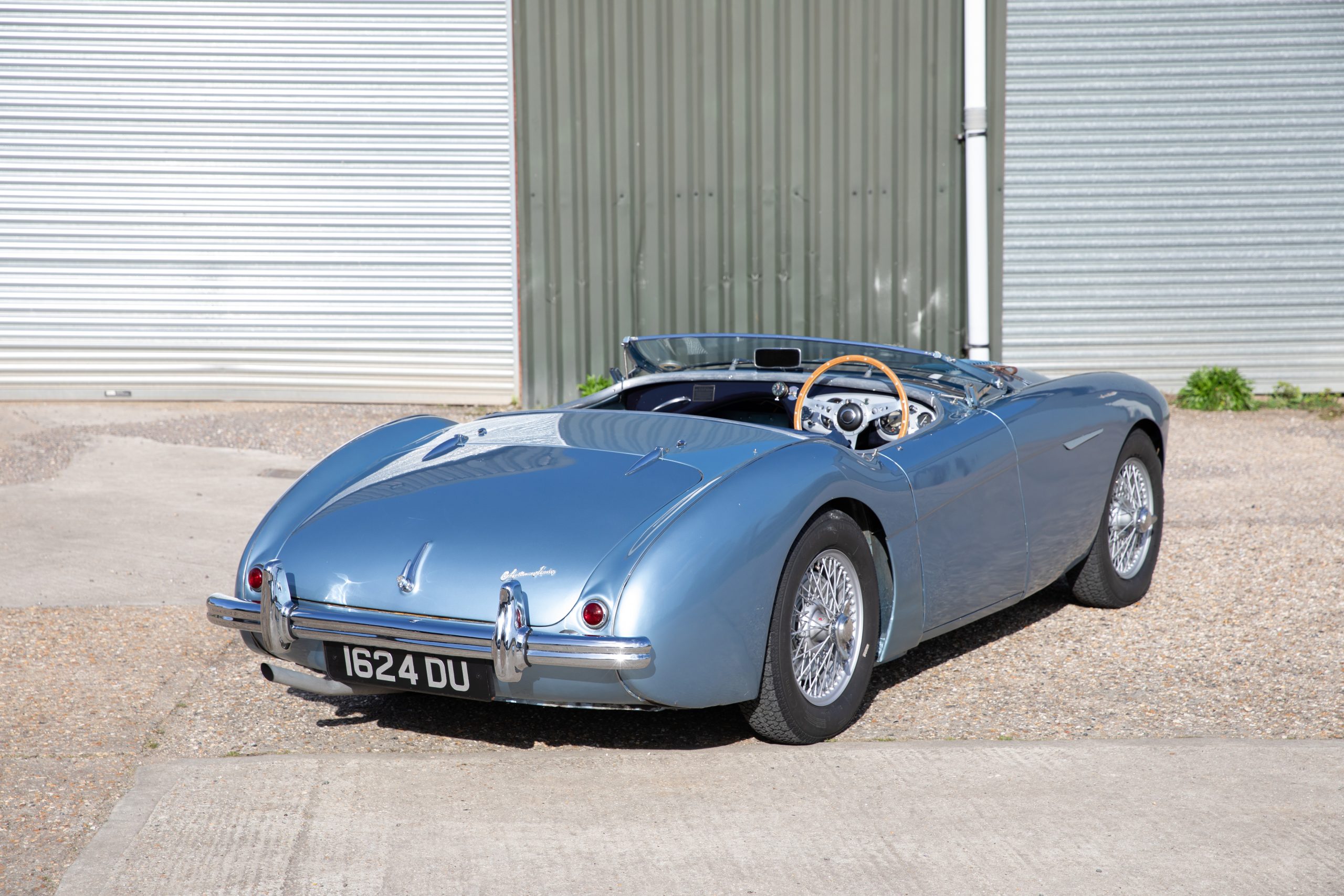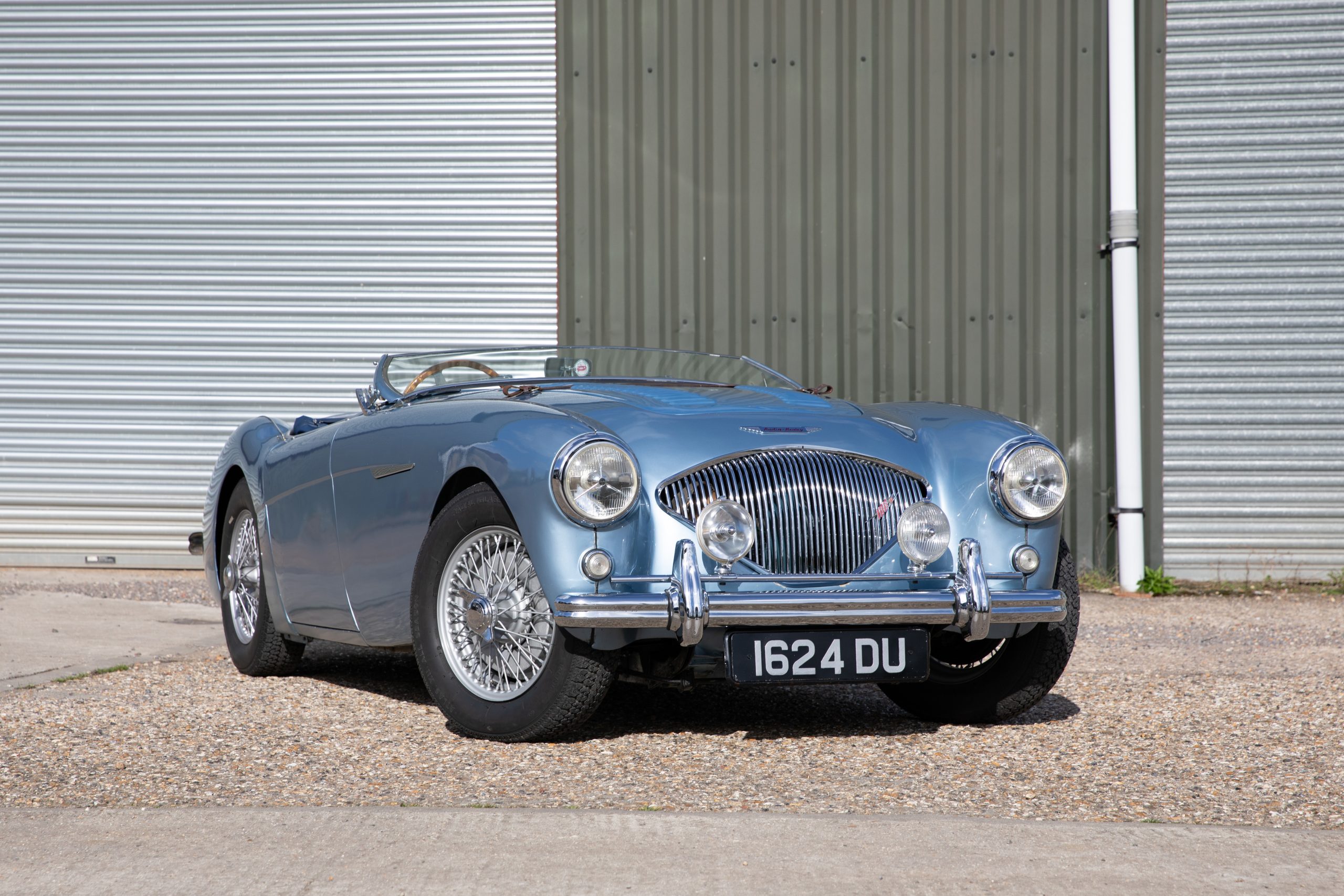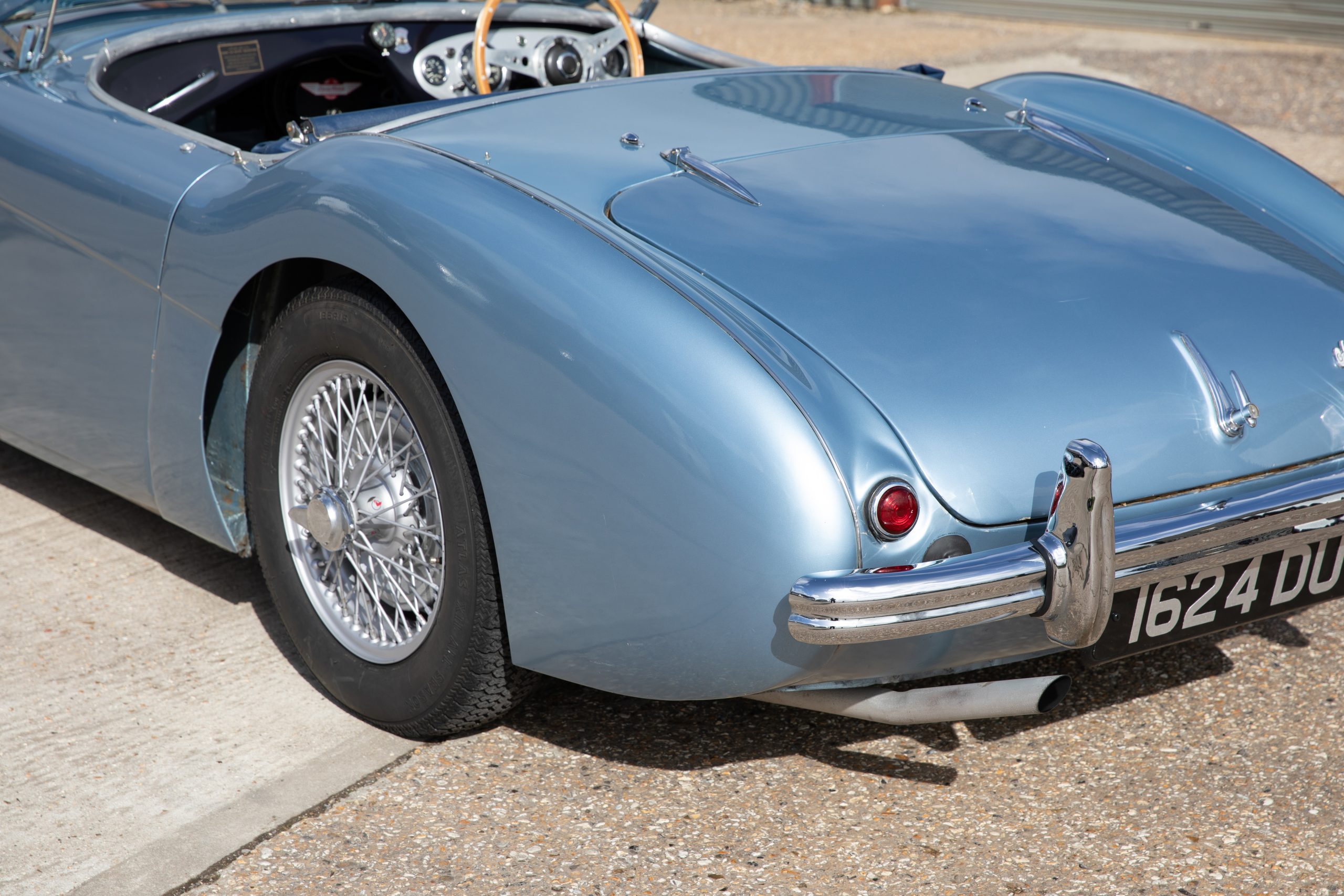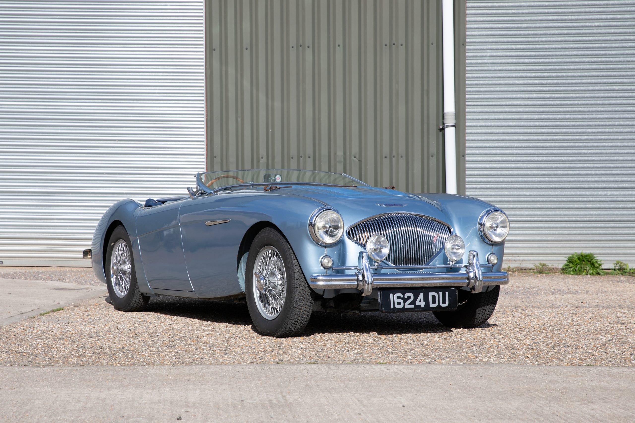 For sale an extremely early example of the Austin Healey 100. 1624 DU is a 1953 BN1 model, built 3rdDecember 1953 and as such features the purest lines of all the Healeys with no door handles, no external fuel filler and single rear light (unique to the earlier cars with later cars spawning reflectors). Finished in Healey Blue metallic with Aluminium Silver wire wheels and a duo-tone Navy/ Light Blue interior with dark Navy carpet set. The car is fitted with the full 100M kit including louvred bonnet.