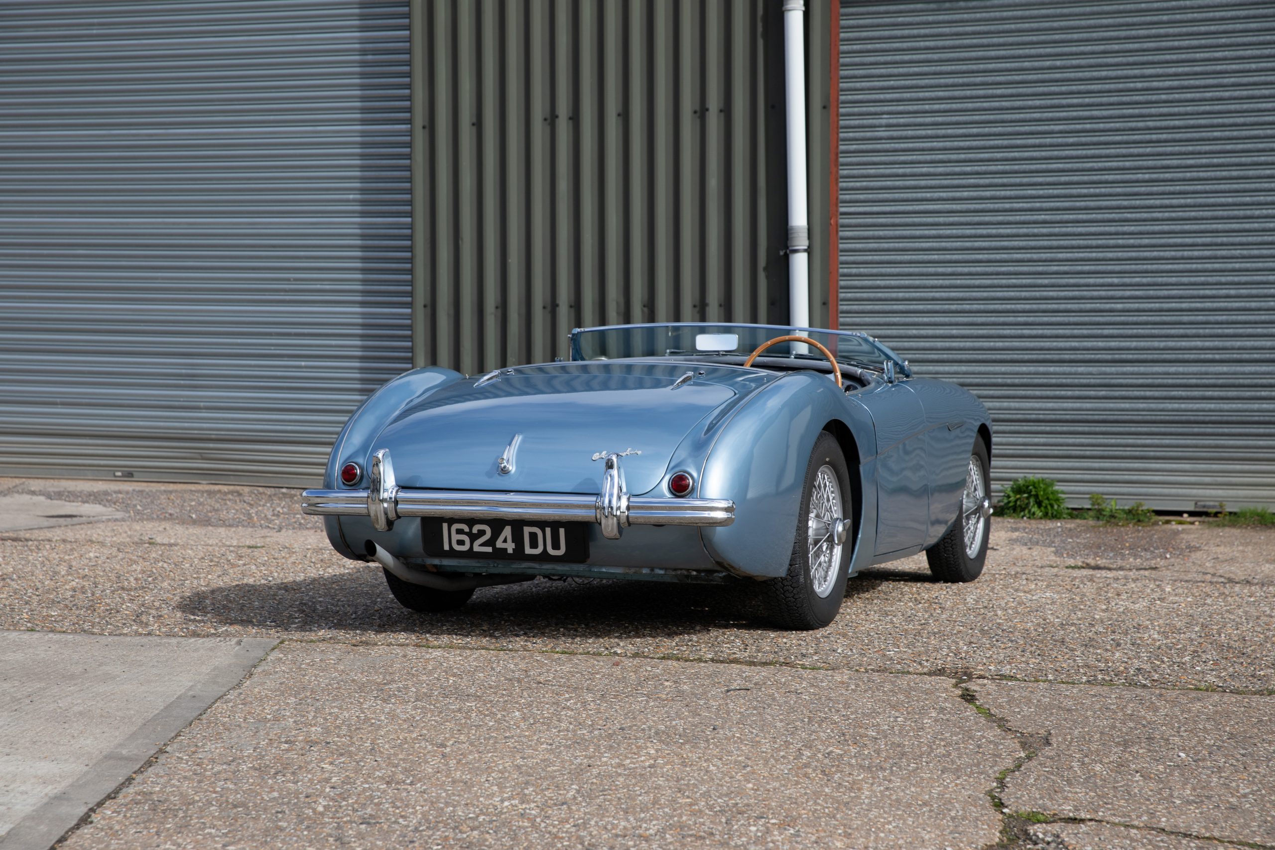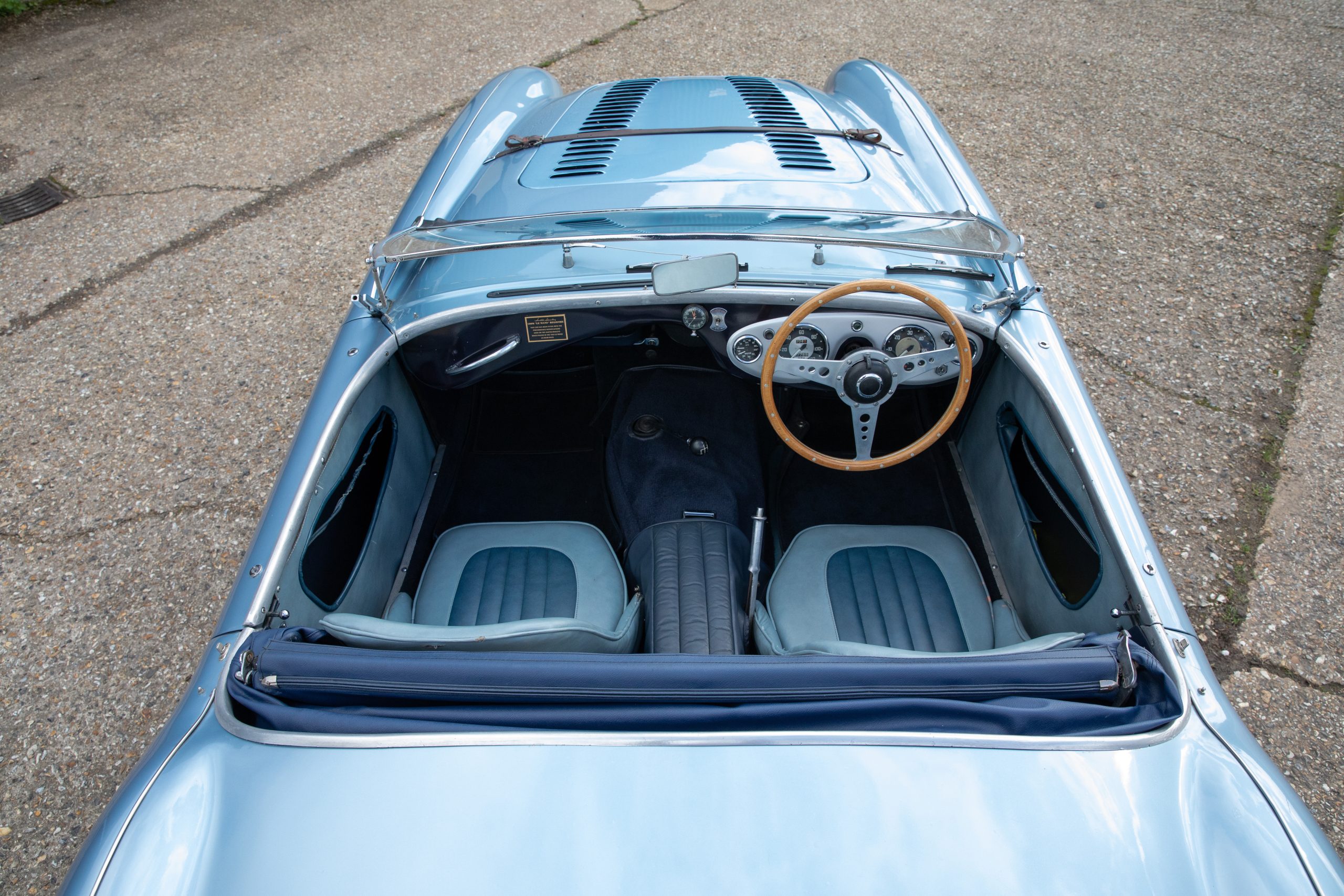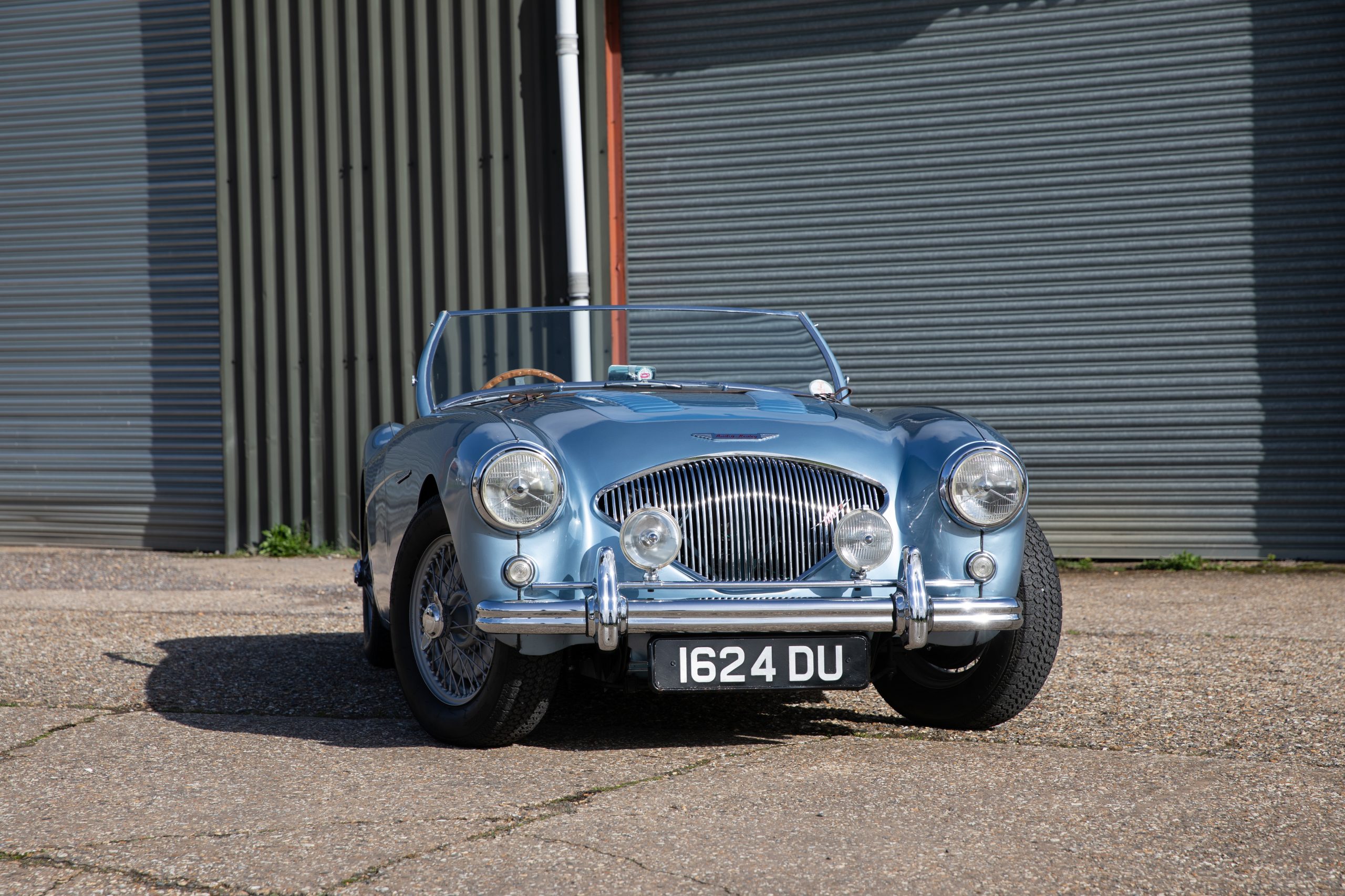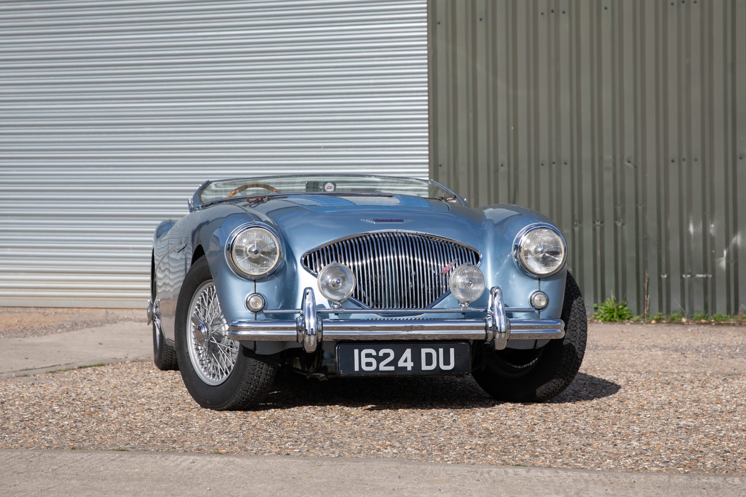 For sale an extremely early example of the Austin Healey 100. 1624 DU is a 1953 BN1 model, built 3rdDecember 1953 and as such features the purest lines of all the Healeys with no door handles, no external fuel filler and single rear light (unique to the earlier cars with later cars spawning reflectors). Finished in Healey Blue metallic with Aluminium Silver wire wheels and a duo-tone Navy/ Light Blue interior with dark Navy carpet set. The car is fitted with the full 100M kit including louvred bonnet.