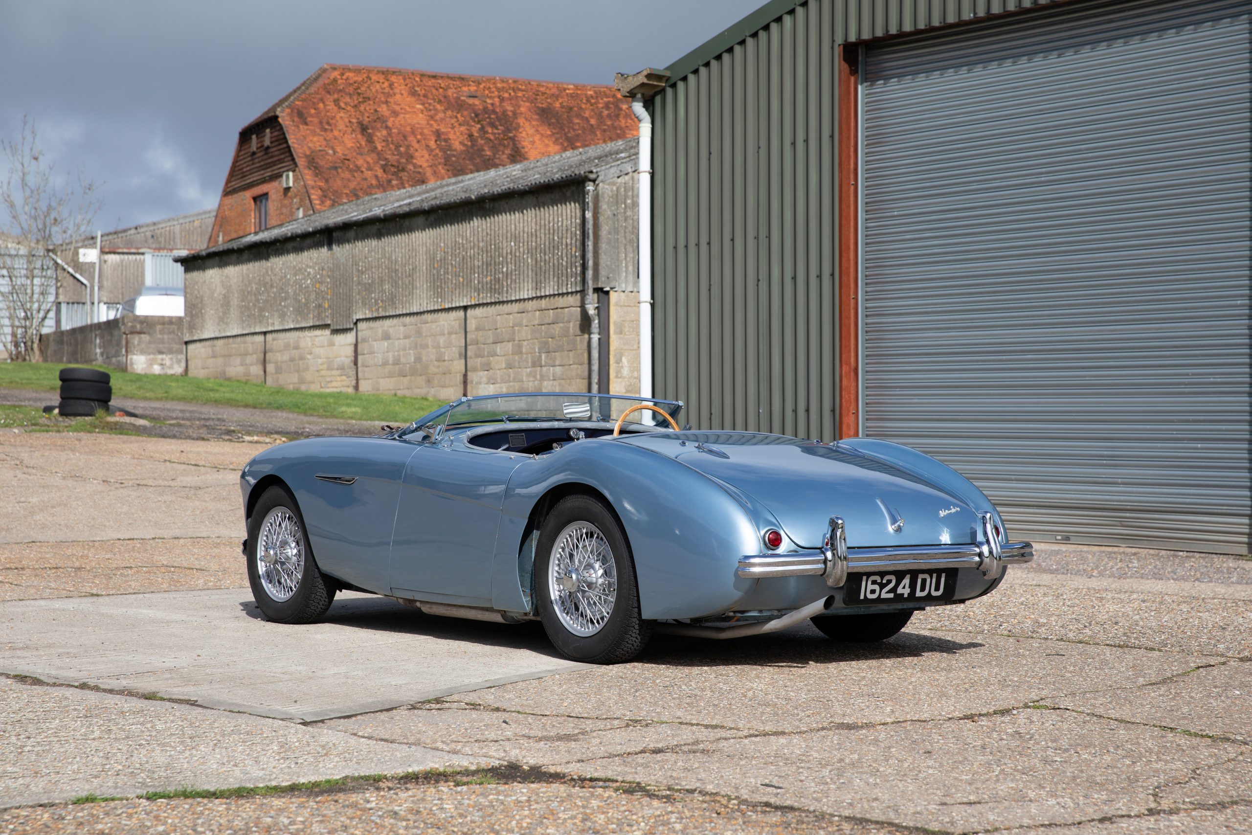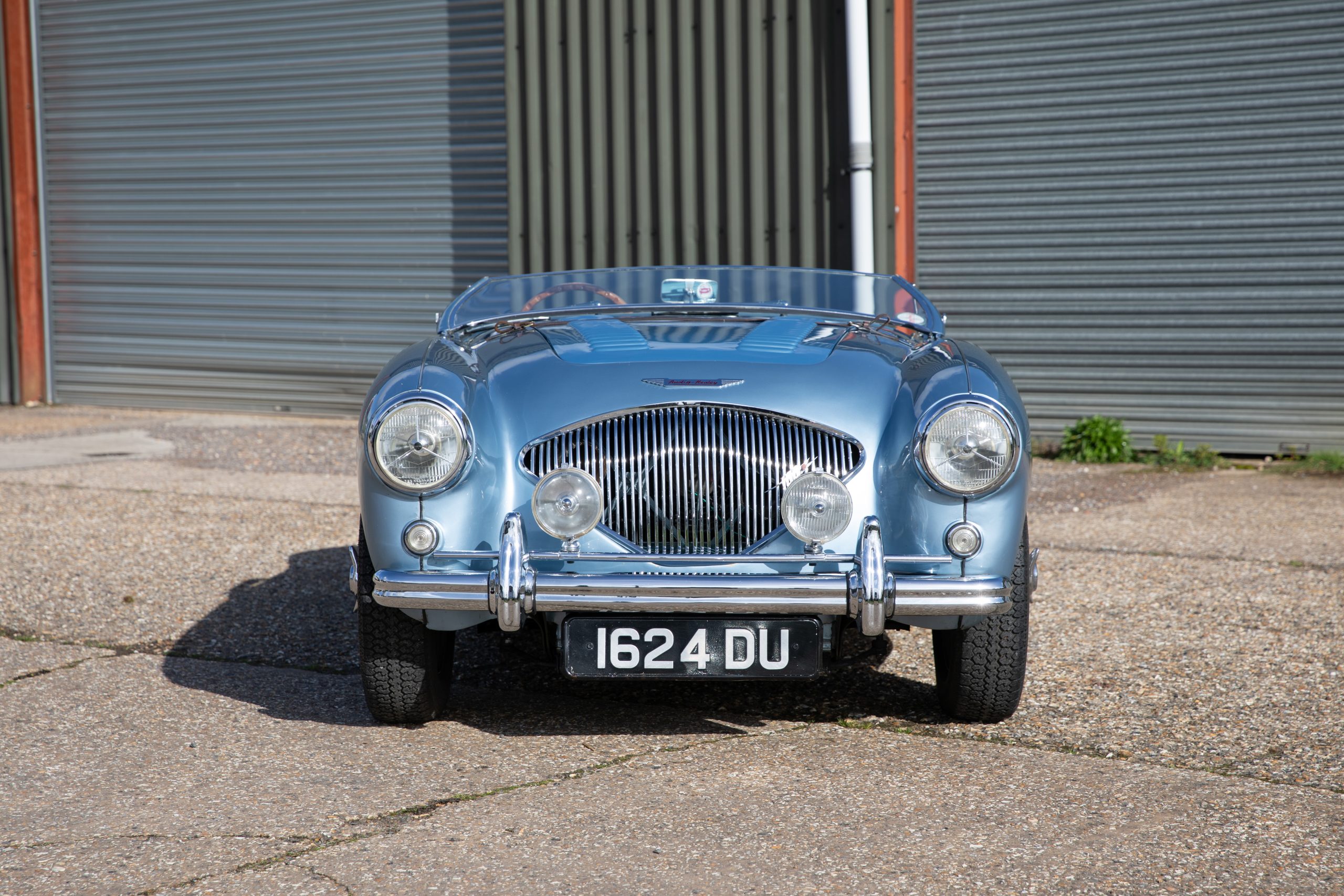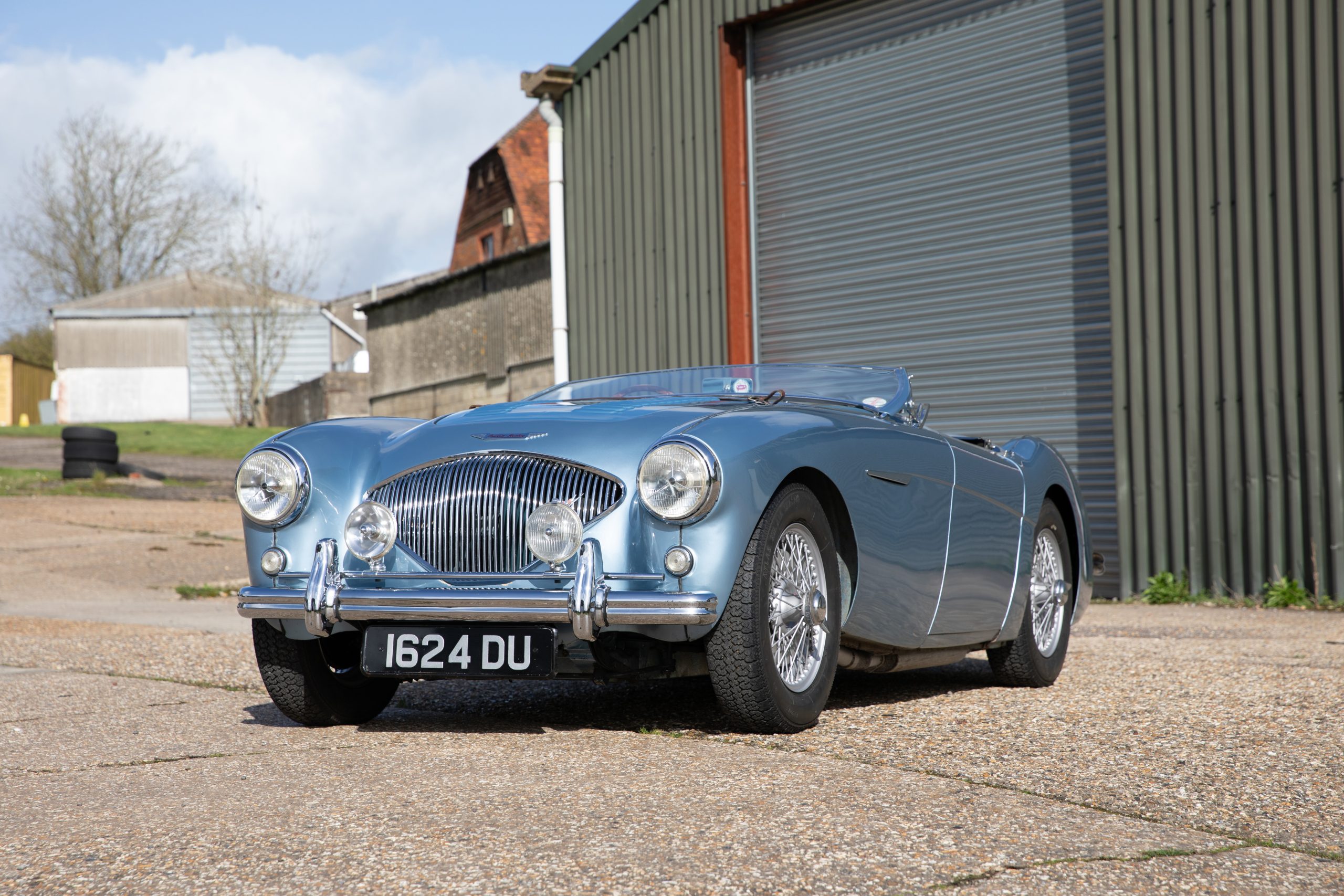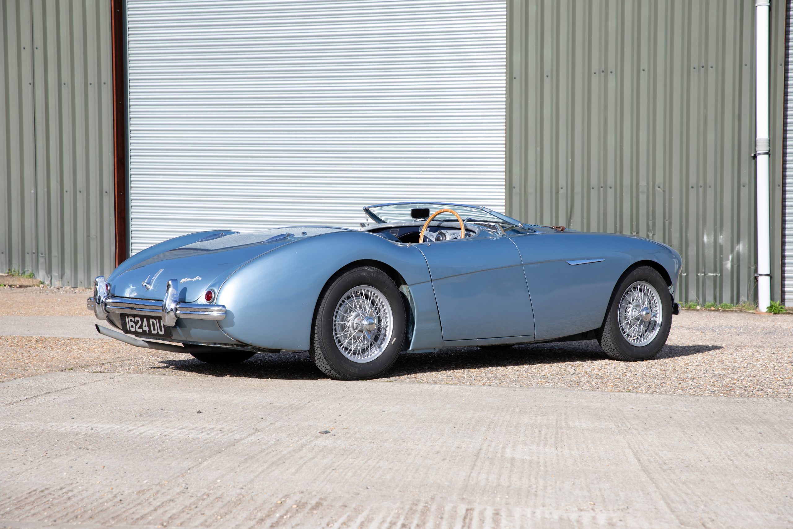 For sale an extremely early example of the Austin Healey 100. 1624 DU is a 1953 BN1 model, built 3rdDecember 1953 and as such features the purest lines of all the Healeys with no door handles, no external fuel filler and single rear light (unique to the earlier cars with later cars spawning reflectors). Finished in Healey Blue metallic with Aluminium Silver wire wheels and a duo-tone Navy/ Light Blue interior with dark Navy carpet set. The car is fitted with the full 100M kit including louvred bonnet.