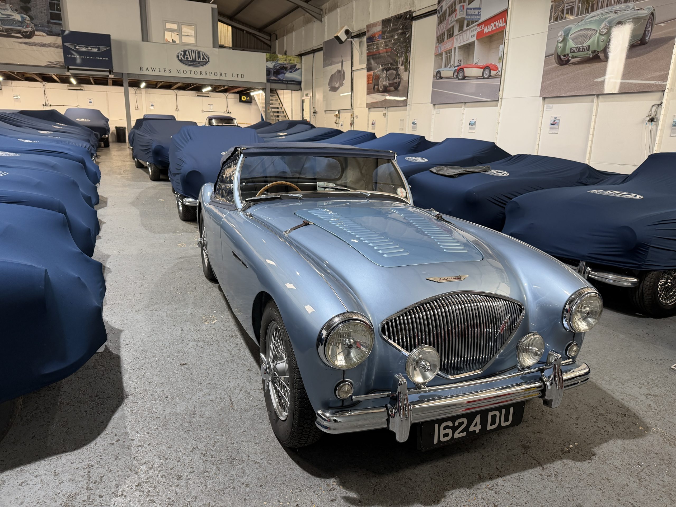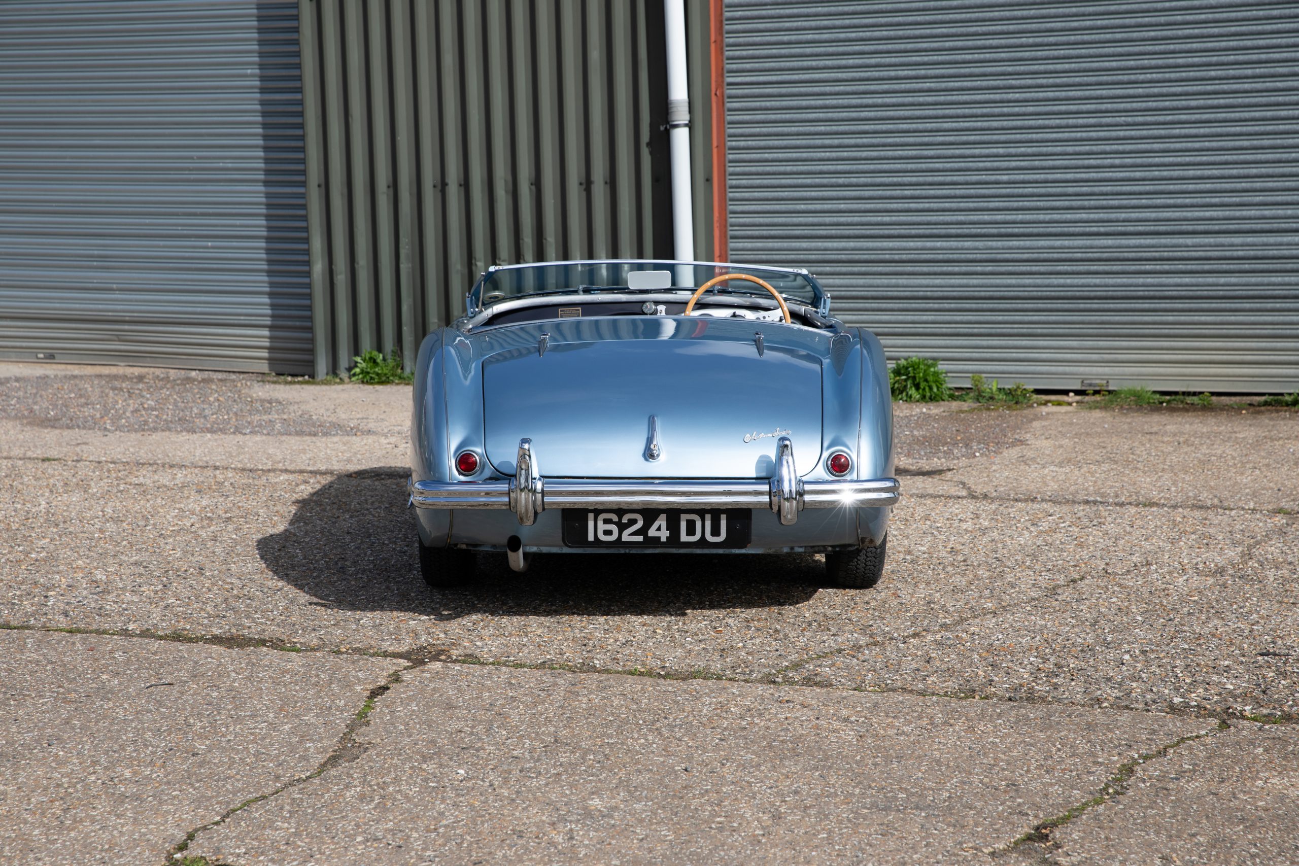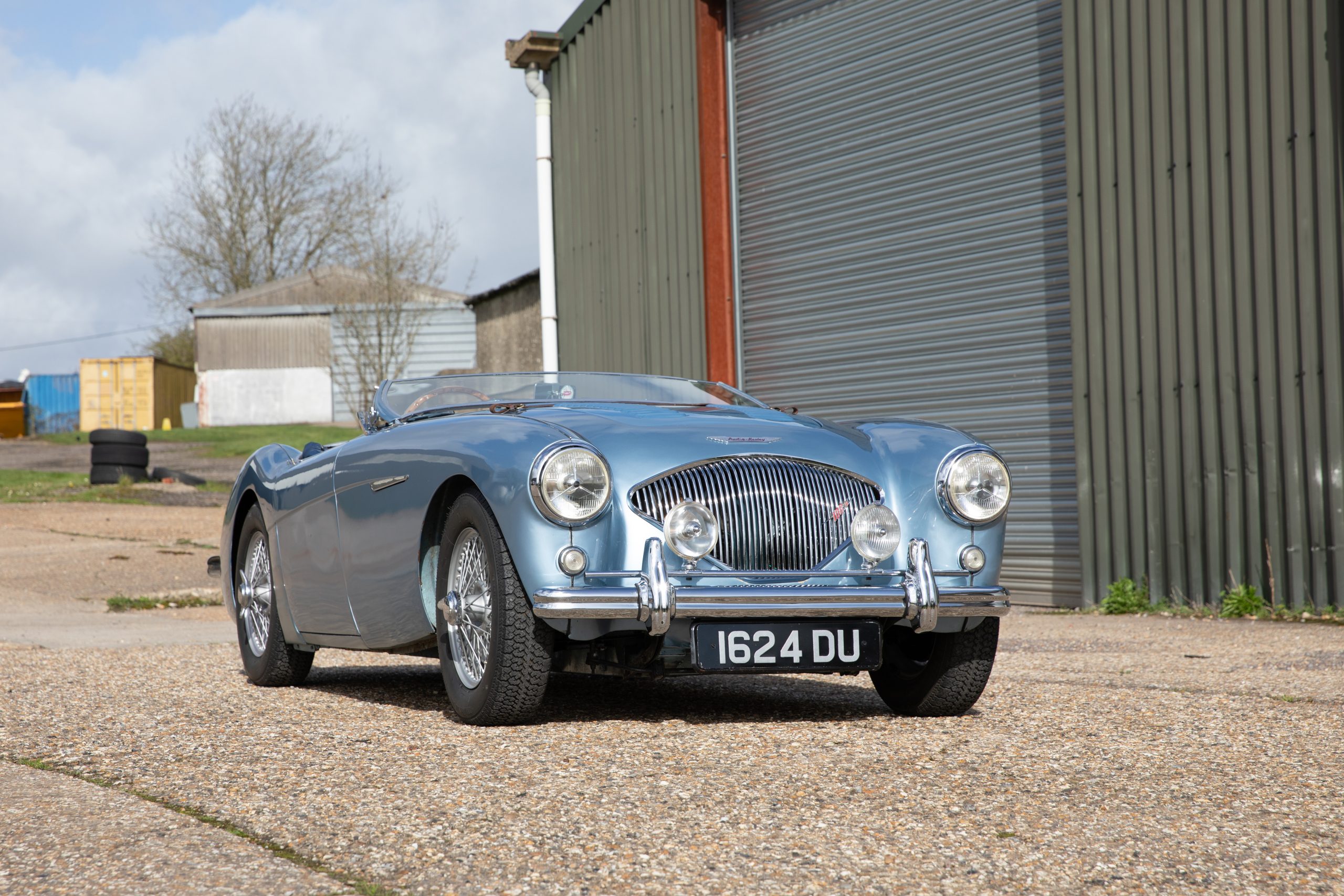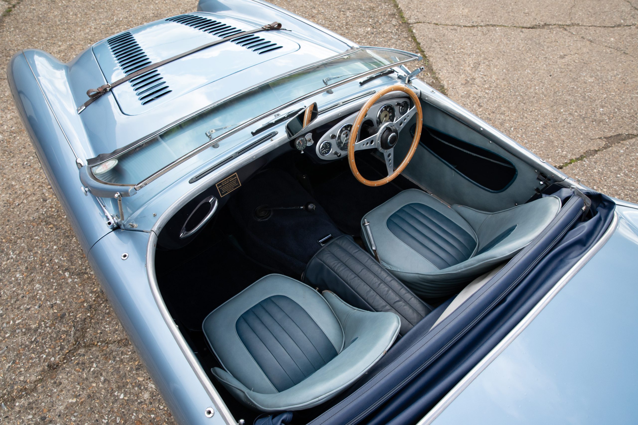 For sale an extremely early example of the Austin Healey 100. 1624 DU is a 1953 BN1 model, built 3rdDecember 1953 and as such features the purest lines of all the Healeys with no door handles, no external fuel filler and single rear light (unique to the earlier cars with later cars spawning reflectors). Finished in Healey Blue metallic with Aluminium Silver wire wheels and a duo-tone Navy/ Light Blue interior with dark Navy carpet set. The car is fitted with the full 100M kit including louvred bonnet.
