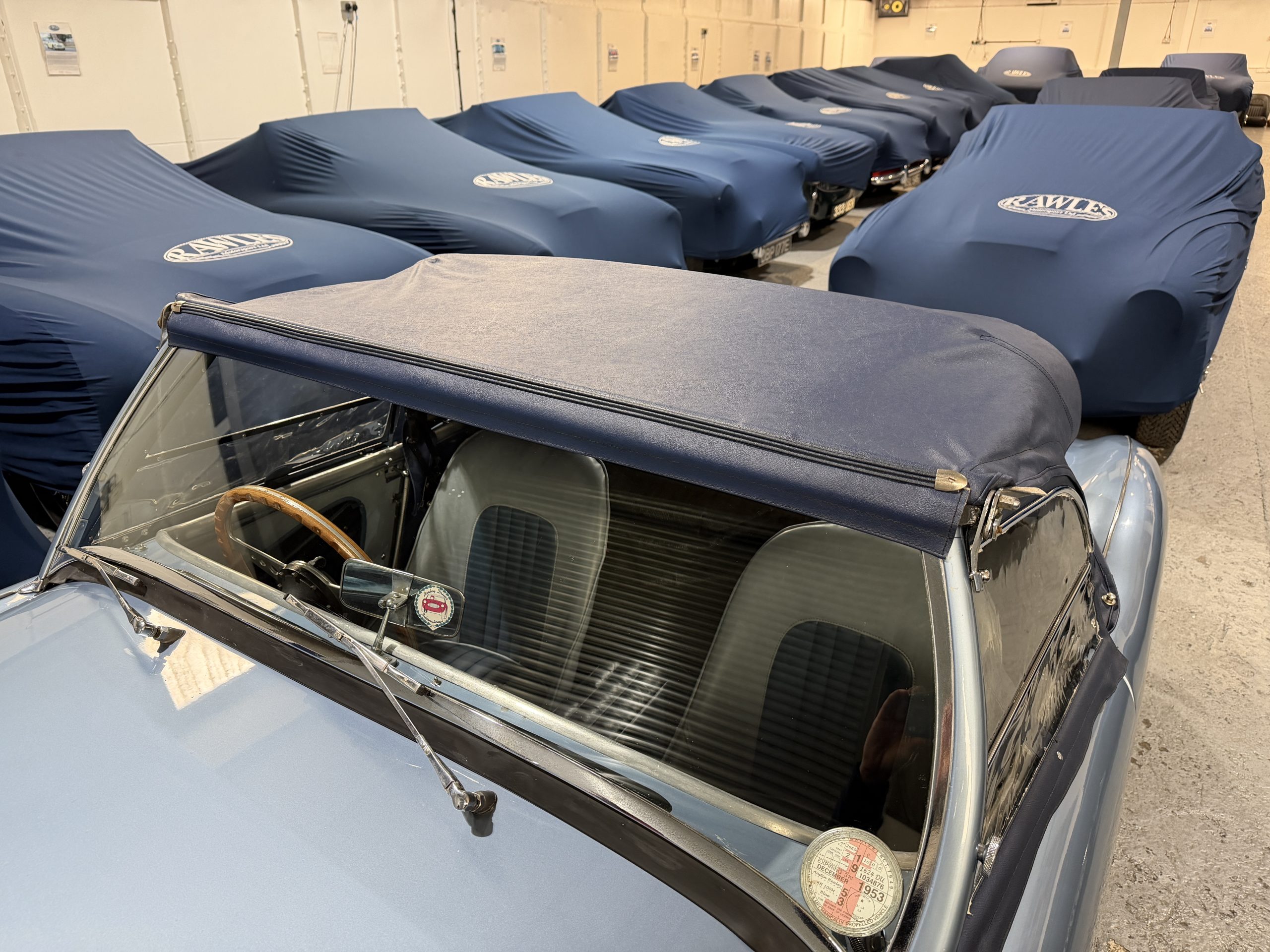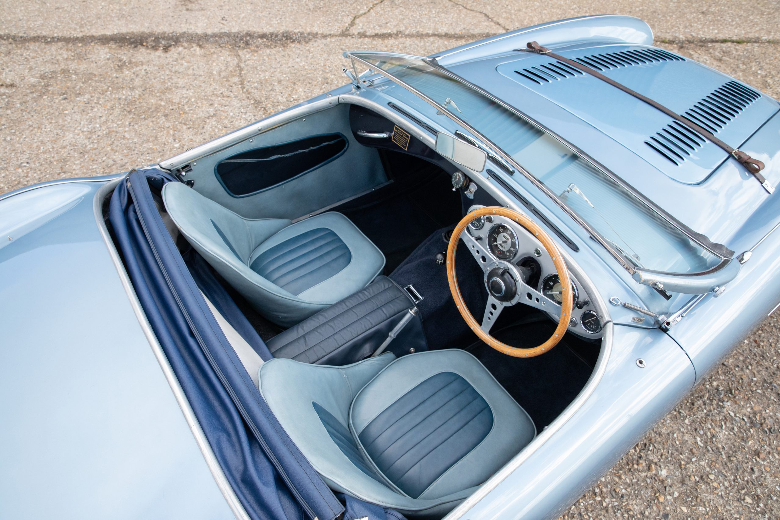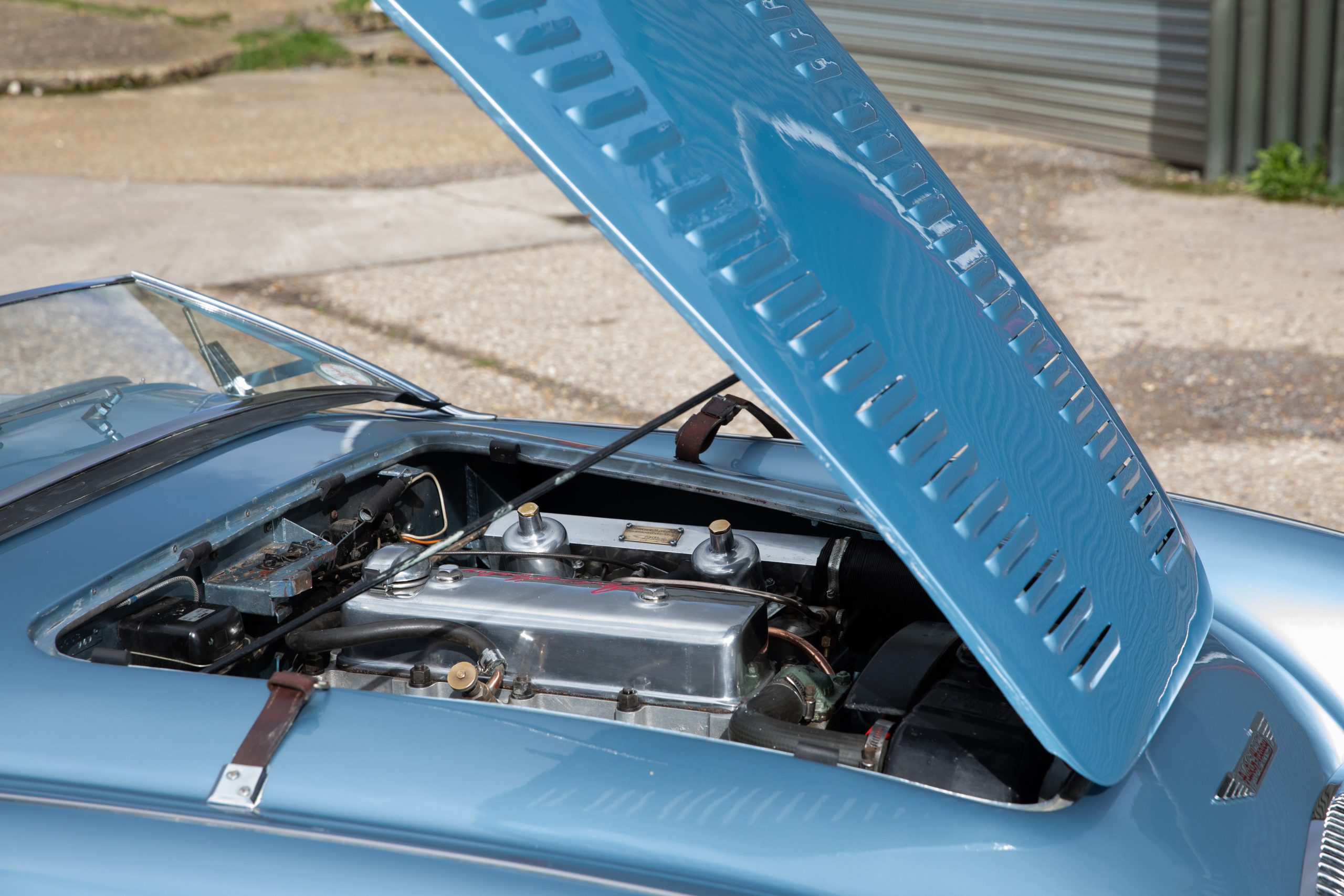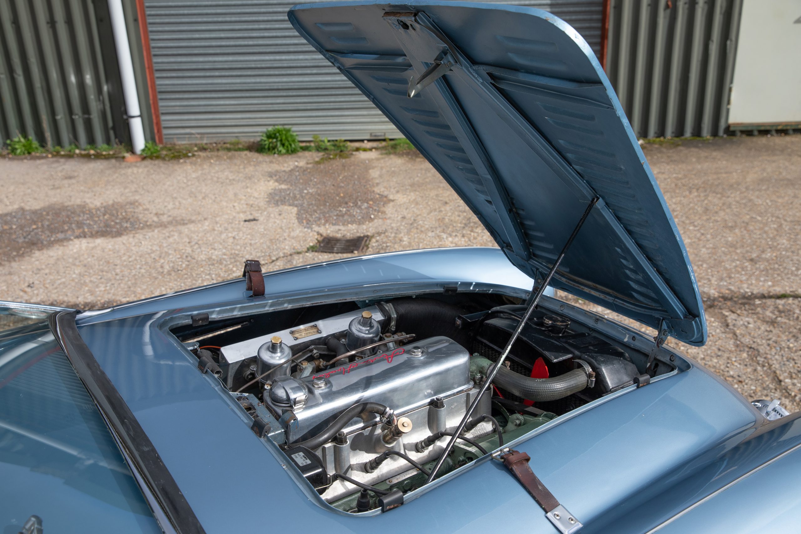 Restored in 1992-1994 this beautiful car has covered just 7,800 miles since and was previously property of a former garage operator who spent much time maintaining and improving the car where he could. This includes 100M carburettors, 100M cold air box and ram air pipe and a 100M louvred bonnet plus the addition of original twin Lucas spotlamps. In the last 5 years an aluminium head including uprated valves has been fitted to the engine giving improved performance to the already improved engine. The soft top is also understood to be new around this time and does not appear to have been used, the side screens are new and unused.