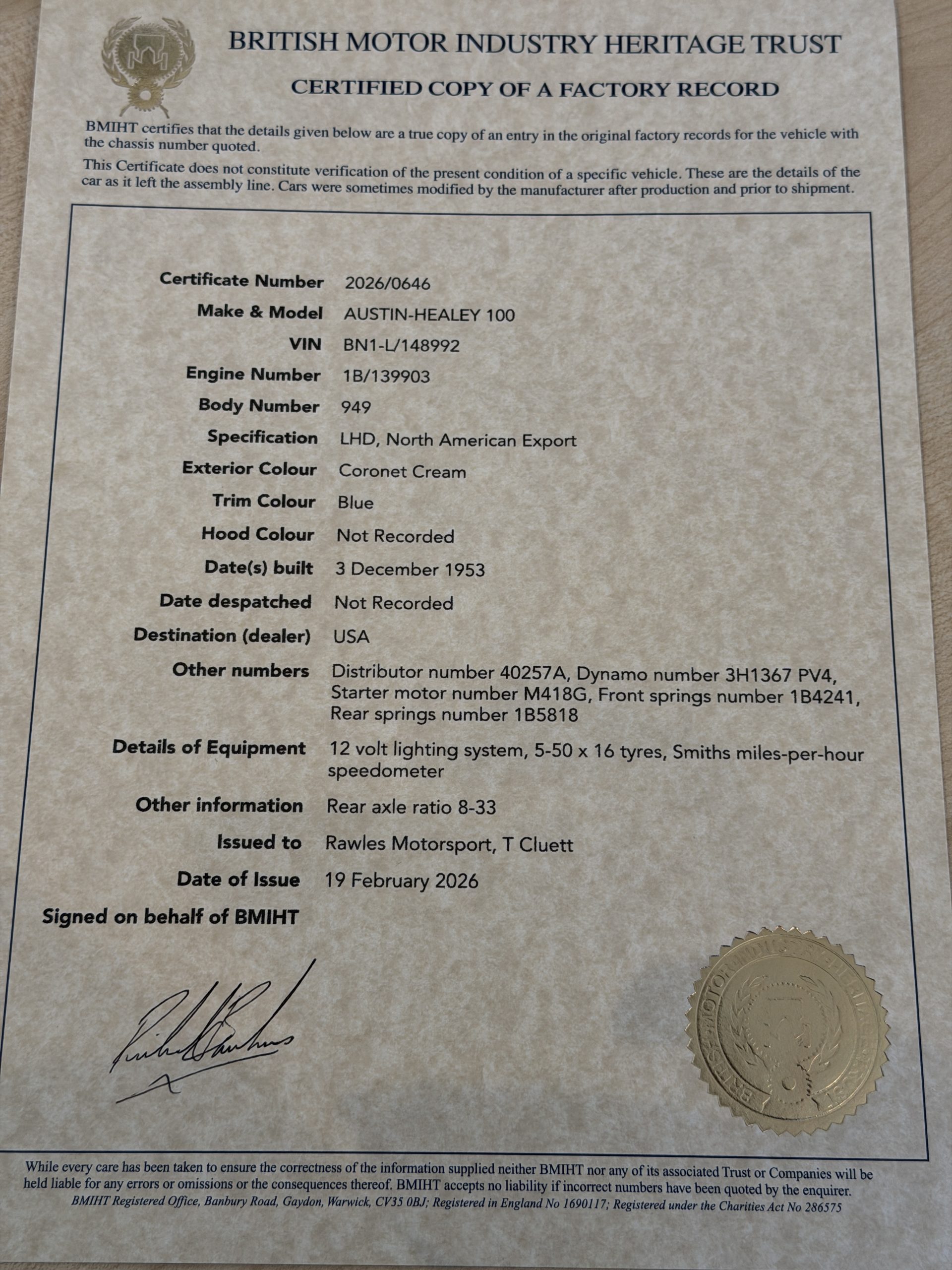 Austin Healey 100 BN1 to M Specification