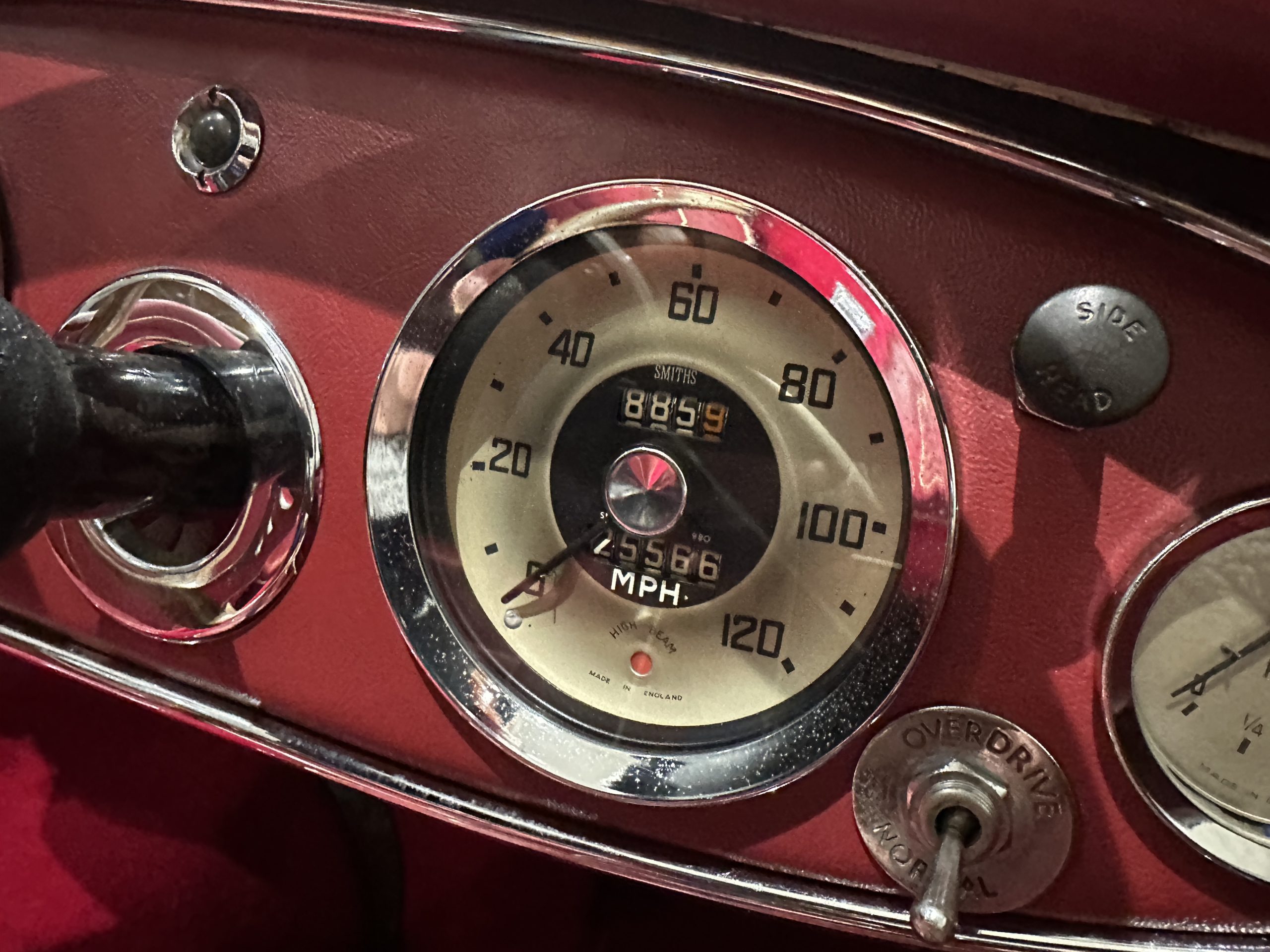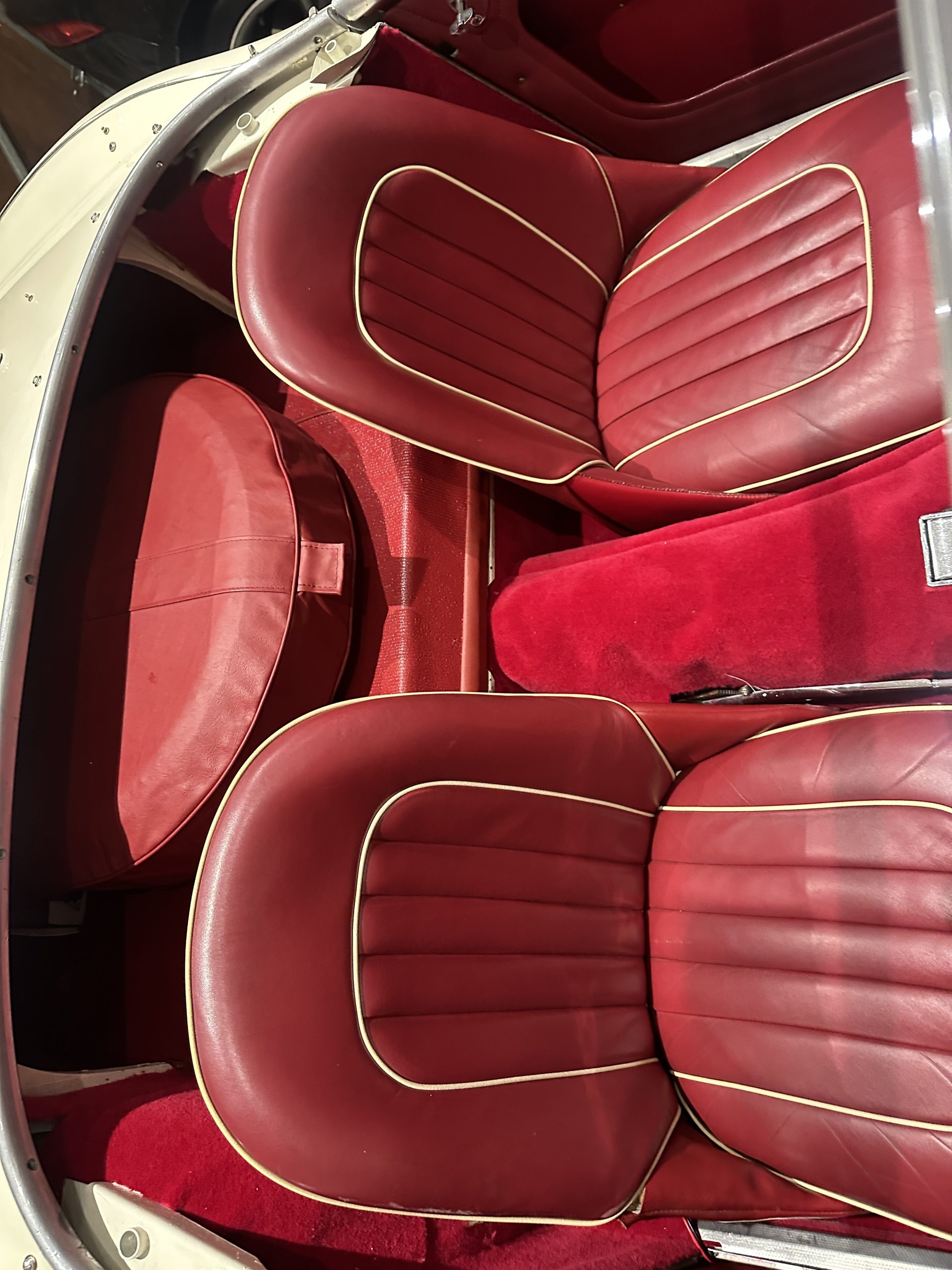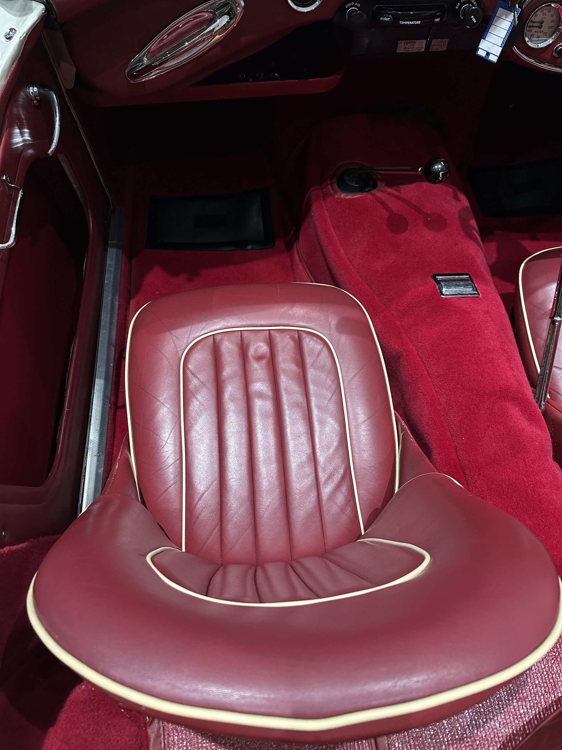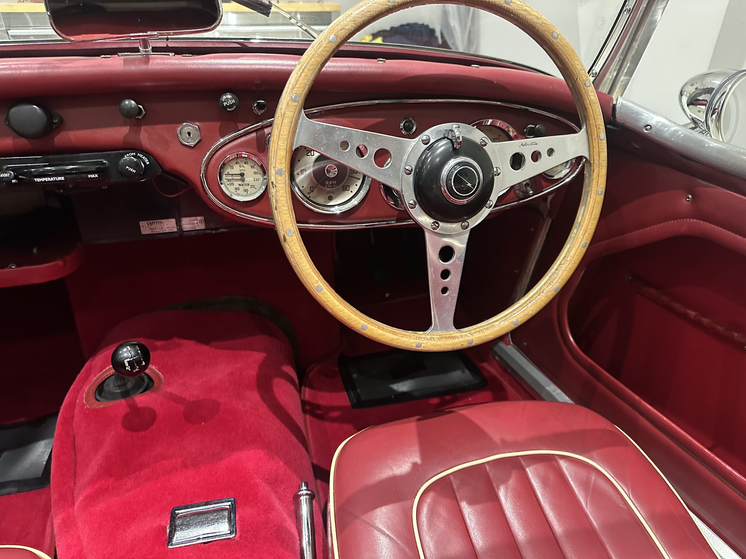 Inside the interior presents extremely well with new carpet and a new spare wheel glove fitted in 2026, the leather seating is in excellent condition and like the carpet a very attractive dark red colour. A period Moto-Lita 15” is fitted.