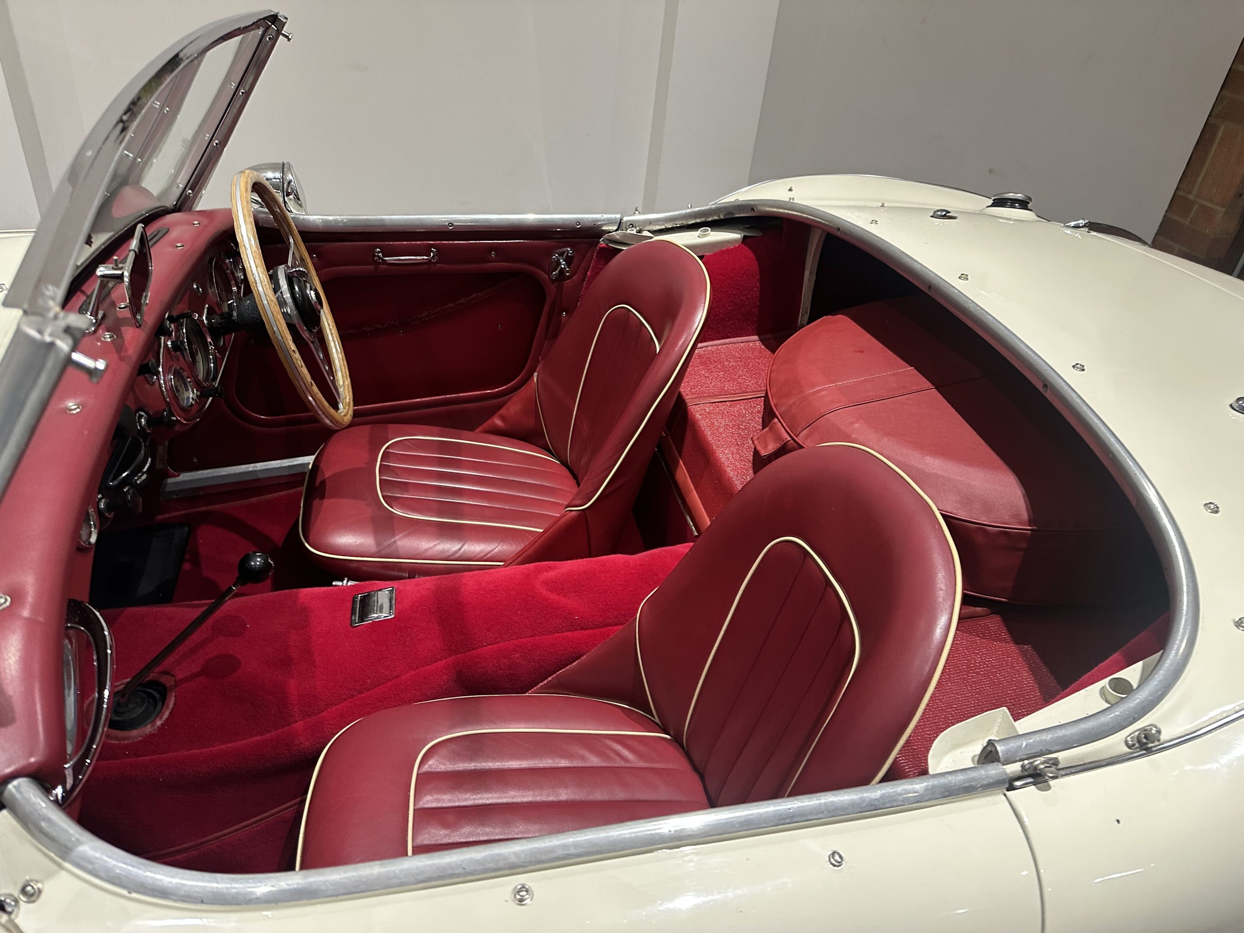 Built between 30th June and 1st July 1959, YFO 847 is a very rare, original right hand drive two-seater (BN7 model). Well optioned with wire wheels, a heater and overdrive. Finished in its very classy original colours of Ivory White with Red leather seats featuring contrast Ivory piping, Dark Red wool deep pile carpet, Black wet weather gear and Aluminium Silver wire wheels.